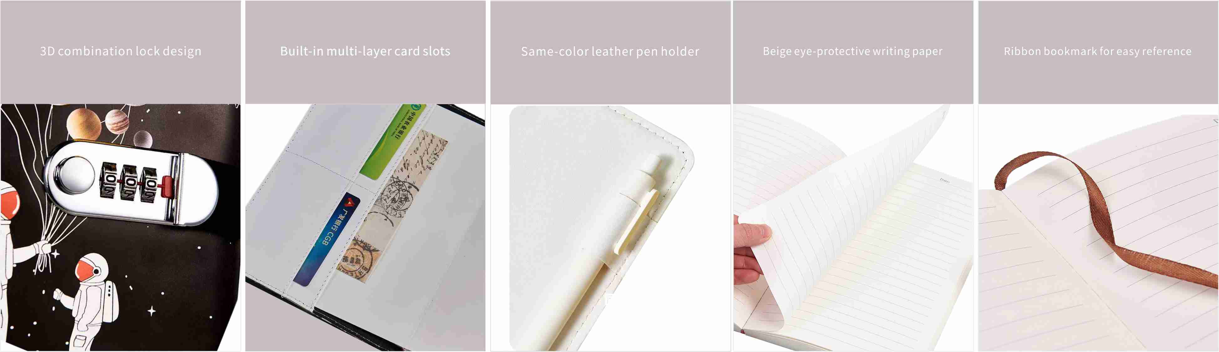 Blocco chiave del diario, questo diario è dotato di un blocco combinato in metallo, che supporta la combinazione di tre cifre 0-9 e ha una varietà di combinazioni di password. È possibile stabilire la funzione di password personalizzata e la copertina è progettata con un tema spaziale, che copre diversi stili artistici. Questi motivi infantili e sognanti non solo rendono il diario bello, ma aggiungono anche un umore felice a te durante la registrazione, come se iniziassi un'avventura spaziale fantastica. Ha anche la funzione di inserire penna e tasca interna, che è conveniente per la conservazione di alcuni piccoli oggetti.