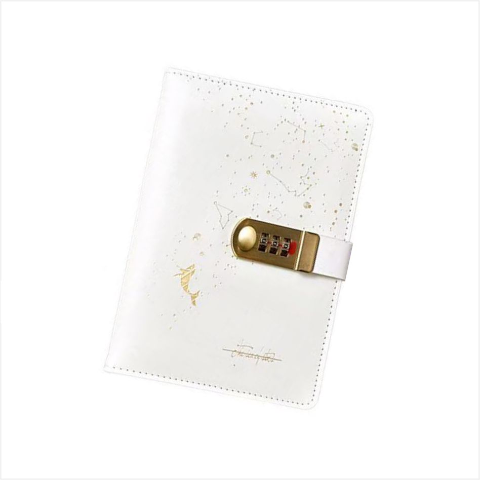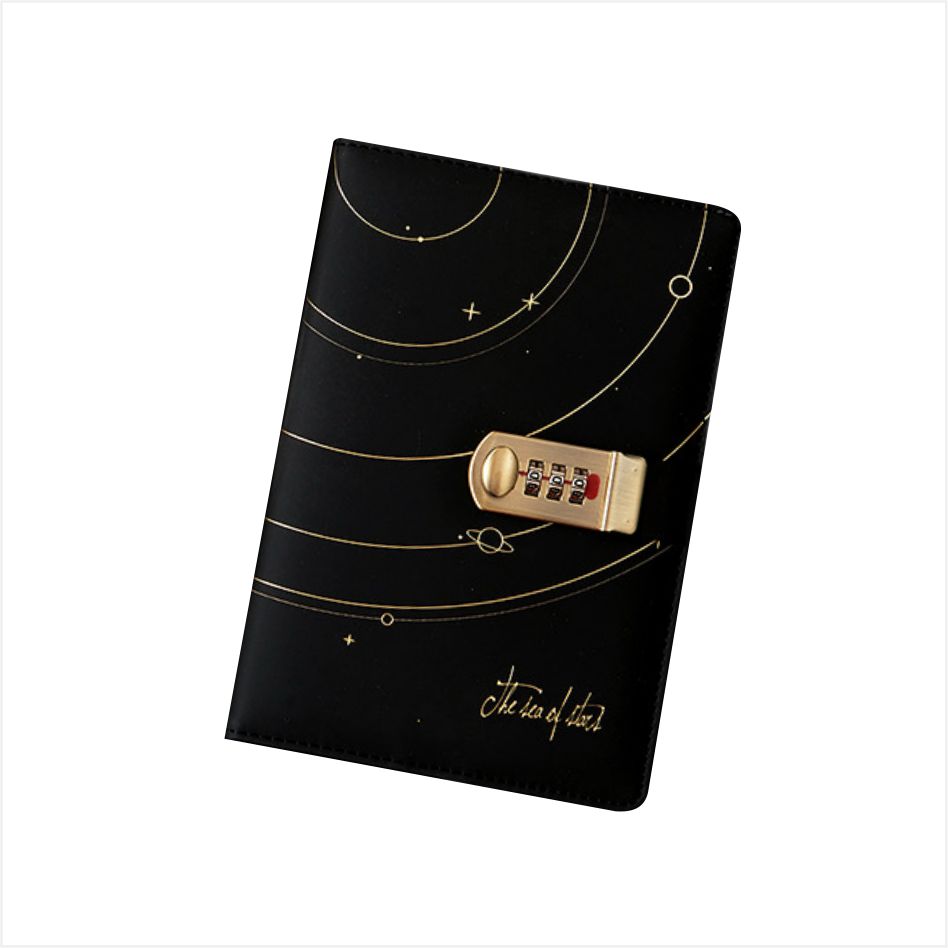 La copertina di questo diario con chiave è realizzata con squisita tecnologia placcata in oro, che delinea una traiettoria simile a un'orbita planetaria con linee semplici, punteggiate da piccoli punti come stelle, come se condensasse il misterioso cielo notturno nell'immagine, silenziosa e piena di immaginazione. È dotato di un lucchetto a combinazione in metallo dorato, controllato da una password di tre cifre. Puoi impostare la tua password per assicurarti che solo tu possa aprire il contenuto.