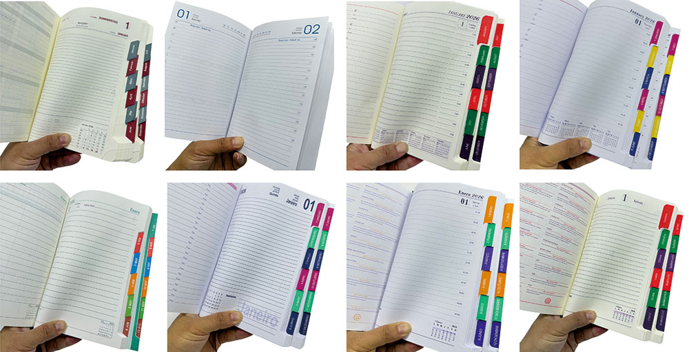 Le pagine interne sono presentate in tedesco, con informazioni personali, calendario, pianificazione mensile, numeri della settimana, pagine orizzontali della sequenza temporale, festività tedesche e mesi tedeschi. Si adatta alle abitudini degli utenti tedeschi e pianifica chiaramente gli orari giornalieri. L'indice del mese laterale consente un posizionamento rapido di mesi e una ricerca conveniente. Il nostro taccuino tedesco ha sia funzioni di pianificazione pratica che un bell'aspetto. È adatto per i registri quotidiani e la gestione del tempo. È adatto sia per le scene dell'ufficio che per la vita.