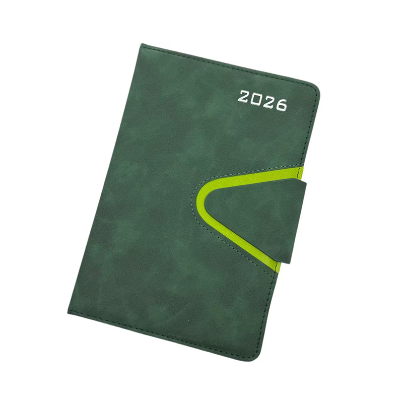 Questo taccuino in tedesco ha una copertura in pelle PU con chicco di cuoio super sensibile, un logo Silver caldo 2026 e un design unico con fibbia magnetica e strisce decorative in verde fluorescente, che è semplice ed elegante.